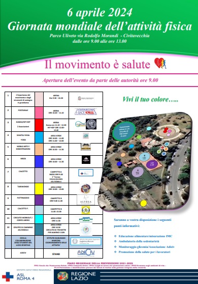 Giovedì 4 aprile alle ore 11 presso il parco Martiri delle Foibe in via Rodolfo Morandi a Civitavecchia si terrà la conferenza stampa per la presentazione dell’evento “Il Movimento è Salute” che si svolgerà sabato 6 aprile, presso il medesimo parco, in occasione della Giornata Mondiale dell’Attività Fisica.