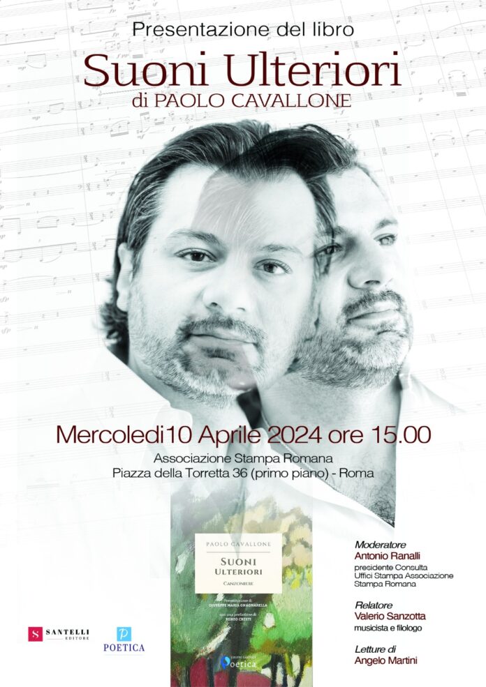 Un viaggio nella “poesica” del compositore Paolo Cavallone, tra musica contemporanea e poesia. E’ quanto prevede la presentazione di “Suoni Ulteriori”, il volume scritto dallo stesso Cavallone, tra i compositori italiani più apprezzati a livello internazionale, che sarà presentato mercoledì 10 aprile, alle ore 15, a Roma nella sede dell’Associazione Stampa Romana (Piazza della Torretta, 36 – 1° Piano). L’ingresso è libero. All’incontro, oltre all’autore, interverranno il presidente della Consulta uffici stampa dell’Associazione Stampa Romana, Antonio Ranalli, il musicista e filologo Valerio Sanzotta e rappresentanti delle istituzioni. Alcuni estratti del volume saranno letti dal giornalista Angelo Martini.