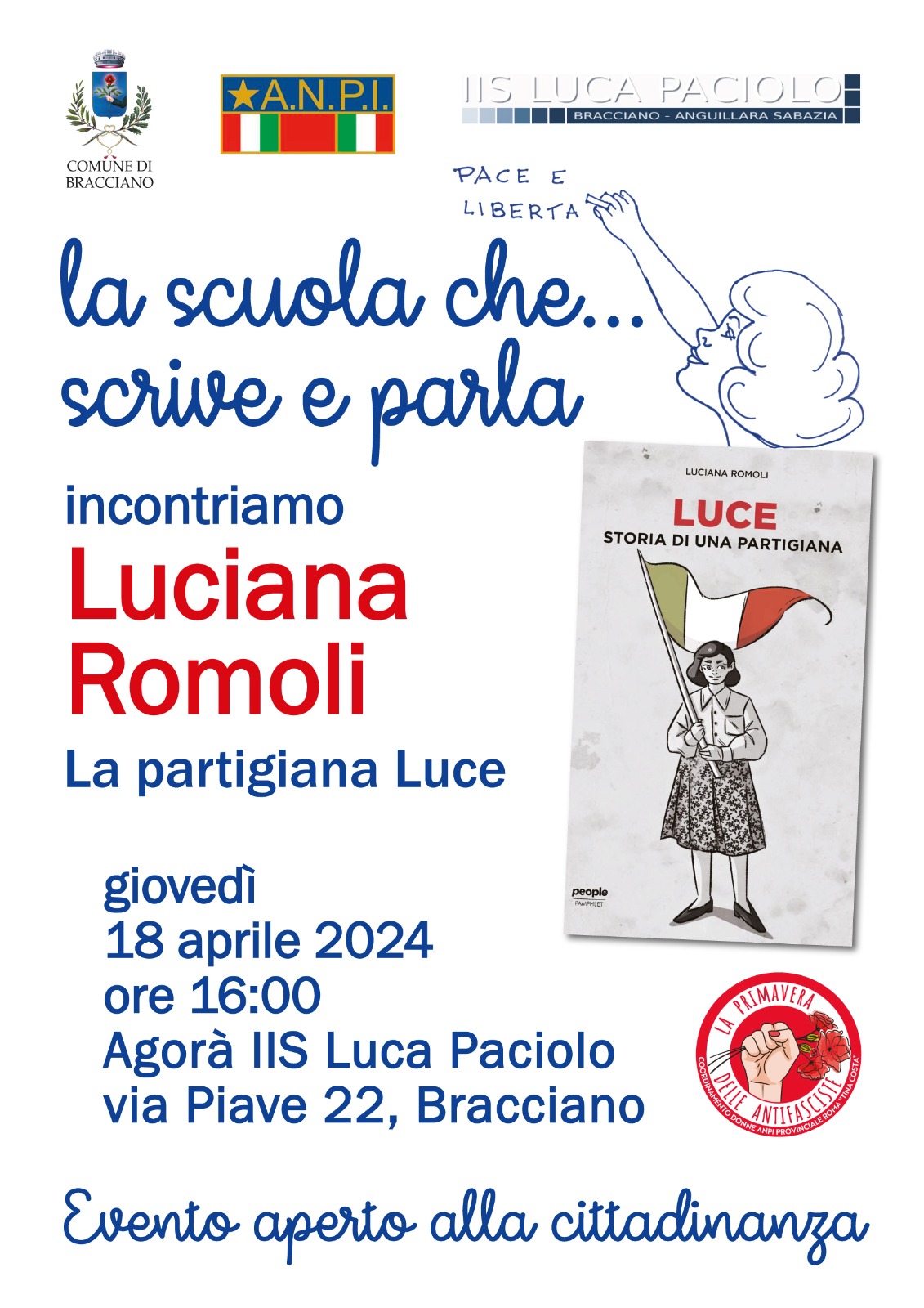 Nell’ambito del ciclo di iniziative “La primavera delle antifasciste” promosso dal Coordinamento donne dell’ANPI Provinciale di Roma, in collaborazione con l’IIS “Luca Paciolo” e con il patrocinio del Comune di Bracciano, il 18 aprile prossimo avremo il piacere di ospitare a Bracciano la partigiana Luciana Romoli “Luce”, giovanissima staffetta nella Resistenza romana.