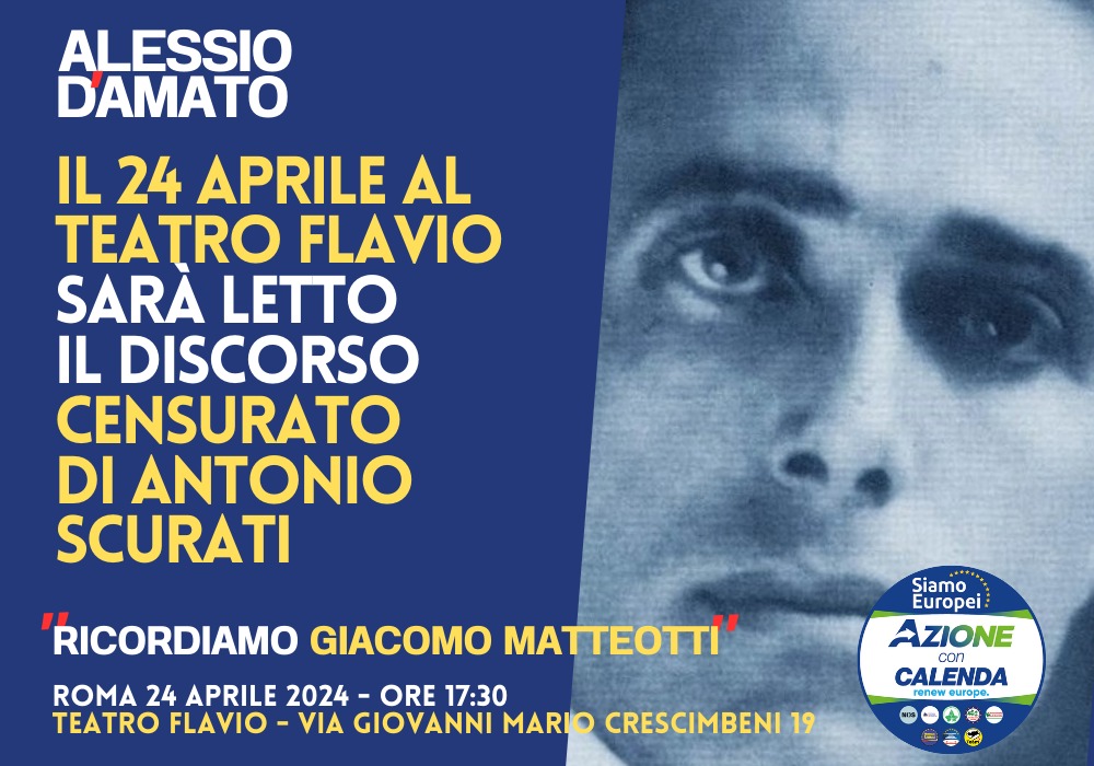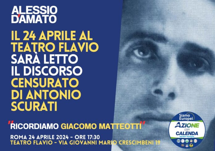 “Il 24 aprile, in occasione dell’iniziativa che ricorda a Roma, al Teatro Flavio, l’uccisione di Giacomo Matteotti, verrà letto il monologo oscurato dalla Rai di Antonio Scurati. L’iniziativa già in programma, che prevede tra gli altri la presenza della professoressa Simona Colarizi e dei giovani di Azione, prevede anche la lettura dell’ultimo discorso parlamentare del leader socialista ucciso dalla ferocia fascista, che verrà letto dal giornalista radiofonico Riccardo Cotumaccio”. Lo ha dichiarato Alessio D’Amato, consigliere regionale e membro della segreteria nazionale di Azione.