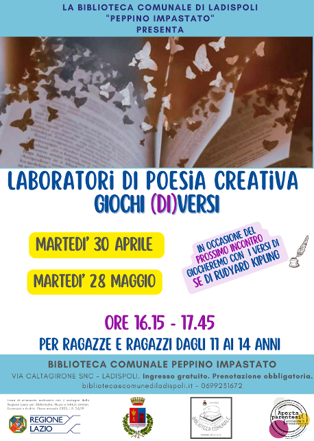 L’amministrazione comunale di Ladispoli informa che in biblioteca tornano i Giochi (di)versi – Laboratori di poesia creativa, dedicati ai ragazzi e ragazze dagli 11 ai 14 anni che potranno mettersi in gioco con un’officina poetica. Dopo il successo del primo appuntamento con Giacomo Leopardi, martedì 30 aprile dalle 16.15 alle 17.45, è la volta di Rudyard Kipling con la poesia SE Partendo dalla lettura dell’albo illustrato dedicato a questa poesia e seguendo il flusso delle idee e sensazioni provate, ognuno procederà alla creazione di un nuovo e originale componimento, ispirato a quanto visto e ascoltato. Successivamente i ragazzi agiranno come dei veri “poeteppisti”: diffonderanno la propria opera e alcuni versi dell’autore tra le sale della biblioteca, fornendo ad altri utenti l’opportunità di imbattersi nella bellezza della poesia. Il progetto è curato dall’Associazione Aperta Parentesi ed è realizzato con il sostegno della Regione Lazio per Biblioteche, Musei e Archivi – Piano annuale 2023, L.R. 24/2019. L’evento, inserito nel Programma del Maggio dei Libri della Biblioteca di Ladispoli, si terrà in Sala Conferenze; la partecipazione è libera e gratuita con prenotazione obbligatoria ai contatti della biblioteca.