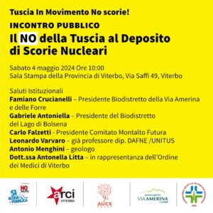 Sabato 4 maggio alle ore 10,00 presso la Sala Stampa della Provincia a Viterbo si svolgerà l’incontro pubblico “il NO della Tuscia al Deposito delle Scorie Nucleari”.