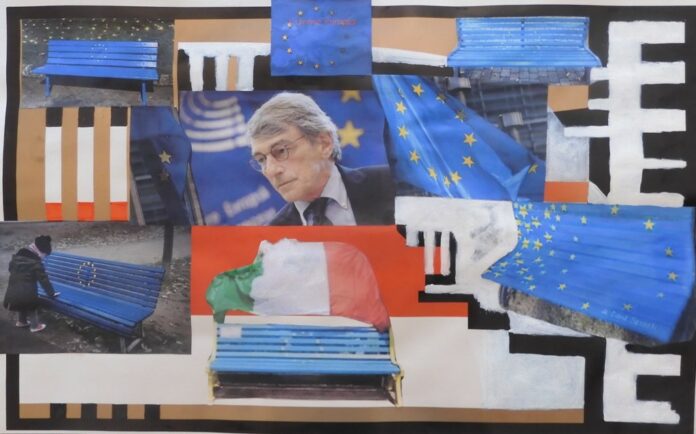 Altiero Spinelli ed Ernesto Rossi, nel 1941 pensarono ad un programma: “Per un’Europa libera e unita”, quando erano stati esiliati sull’isola di Ventotene per essersi messi in contrasto al fascismo, delineando una trasformazione importantissima nella pianificazione di un continente europeo unificato. Il cosiddetto “Manifesto di Ventotene” è una documentazione con la visione europeista di una riforma democratica d’Europa, nell’attuare una federazione europea invogliata agli ideali di pace e libertà, con supporto democratico munito di parlamento e governo, al quale assegnare grandi capacità di tutta la politica estera ed economica. Ecco che interviene Guadagnuolo ispirandosi, come si può vedere, in un suo dipinto con l’isola di Ventotene su una panchina azzurra una delle tante installate in molte città italiane, che vola metaforicamente sulle ali blu e gialle dell’Europa, nei cieli di Firenze, pronta a cogliere l’anima del suo illustre cittadino David Sassoli che diventerà Presidente del Parlamento Europeo. La panchina è un minimo segno per l’edificazione di quella comunità europea in cui lo stesso Sassoli credeva e prestava fede. In un’altra opera, con tecnica mista e collage, Guadagnuolo interpreta le frasi di Sassoli che ha pronunciato quando era Presidente, una in particolare è stata messa nell’opera: “Il dovere delle Istituzioni Europee è proteggere i più deboli e di non chiedere altri sacrifici aggiungendo dolore al dolore”. In alto a sinistra campeggia la cupola del Brunelleschi e a destra un fascio di rose blu simbolo del Parlamento Europeo, un plauso sia per la persona, che per il genio umano che ha creato qualcosa a cui la natura non aveva pensato. La terza opera dal titolo: “Le panchine blu dell’Unione Europea, in Italia, per David Sassoli” esprime l’affetto del popolo italiano per lo stimato politico che non sarà mai dimenticato.