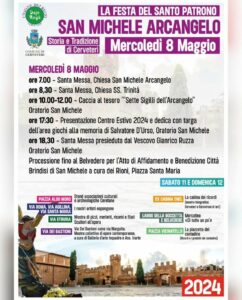 Gli appuntamenti religiosi per il giorno del Patrono, di mercoledì 8 maggio, iniziano dal mattino presto. Alle ore 07:00 sarà celebrata la Santa Messa presso la Chiesa di San Michele Arcangelo, mentre alle ore 08:30 presso la Santissima Trinità. Alle ore 10:00, Caccia al tesoro “Sette sigilli dell’Arcangelo” presso l’oratorio.