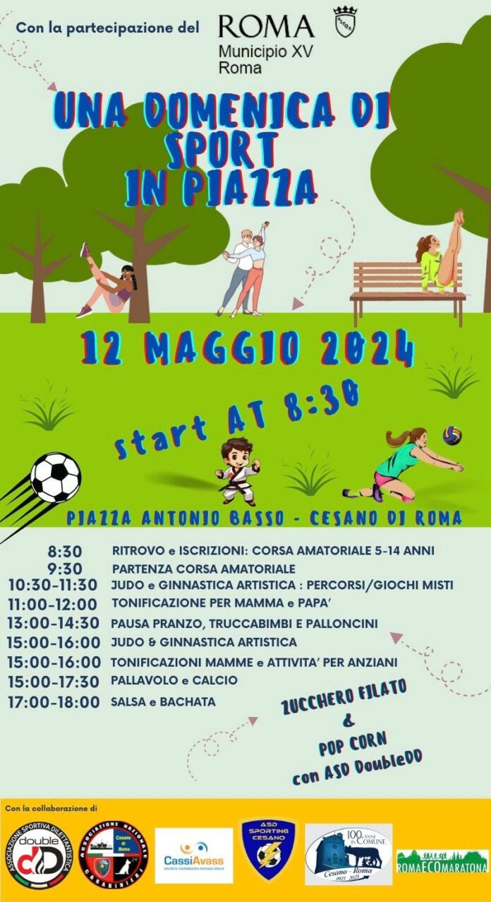 “Vi aspettiamo domenica 12 maggio a Piazza Antonio Basso a Cesano per una giornata all’insegna dello sport e della solidarietà. “Domenica di sport in piazza”, è un’iniziativa che come Municipio XV con il Presidente Daniele Torquati abbiamo promosso insieme all’Associazione Sportiva Dilettantistica Double D, e costruito, come sempre accade nella nostra Comunità, con il contributo e il lavoro delle tante associazioni presenti sul territorio.