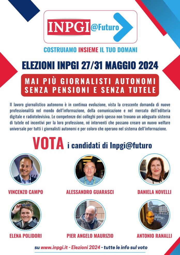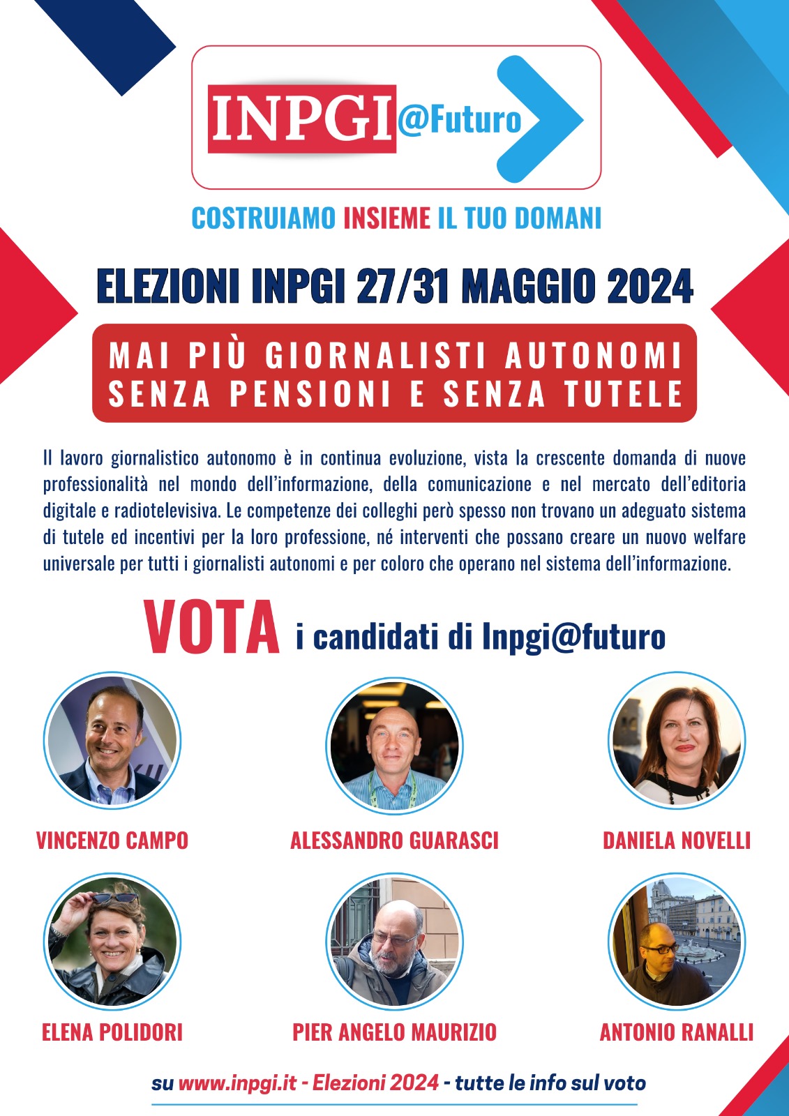 Più tutele per i giornalisti a partita IVA e per i collaboratori occasionali e soprattutto più certezze sulle future pensioni degli autonomi, queste alcune delle proposte della squadra di Inpgi@Futuro per le elezioni (circoscrizione del Lazio) per il rinnovo dell’assemblea dei delegati dell’Istituto Nazionale di Previdenza Italiani “Giovanni Amendola” in programma dal 27 al 31 maggio.