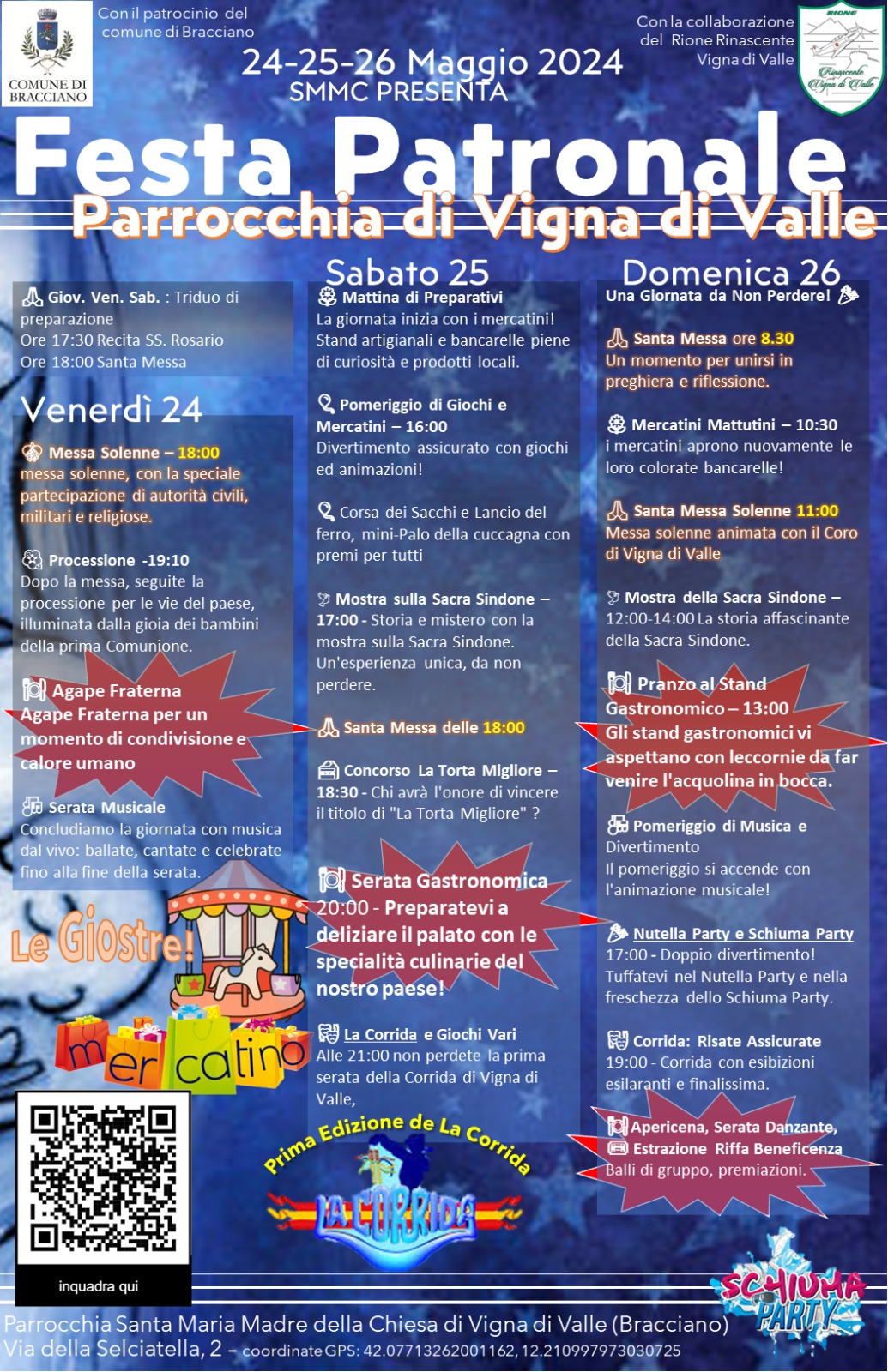 In particolare venerdì 24 maggio la messa sarà presieduta dal Vescovo di Civita Castellana S.E. Marco Salvi e a seguire la processione per le vie della frazione. Si invita la comunità a partecipare numerosa.