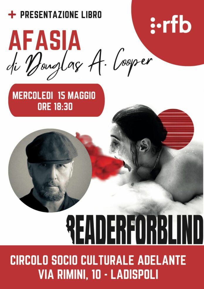 Oggi alle 18 e 30 nel centro culturale Adelante, in via Rimini 10 a Ladispoli, avverrà la presentazione del libro “Afasia”, di Douglas Anthony Cooper. Edito da Readerforblind, l’evento costituisce una grande occasione internazionale per la città balneare, traguardo reso possibile grazie alla cultura. Scrittore e fotografo canadese, direttamente da Toronto, l’autore infatti è in tour in Italia per far conoscere al pubblico la sua nuova l’opera letteraria. Nato a Toronto nel 1960, Douglas Anthony Cooper nel 1992 pubblica il suo primo romanzo, Amnesia, nominato per il Canada First Novel Award e per il Commonwealth Prize. Nel 2003 il romanzo viene pubblicato in Italia per l’editore Fanucci. I suoi libri sono stati pubblicati da Random House, Doubleday, Hyperion (Hachette Books), Quercus e 4th Estate. I suoi scritti e le sue fotografie sono apparsi su “Rolling Stone”, “New York Magazine”, “New York Times” e “Wired”.