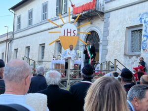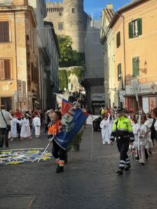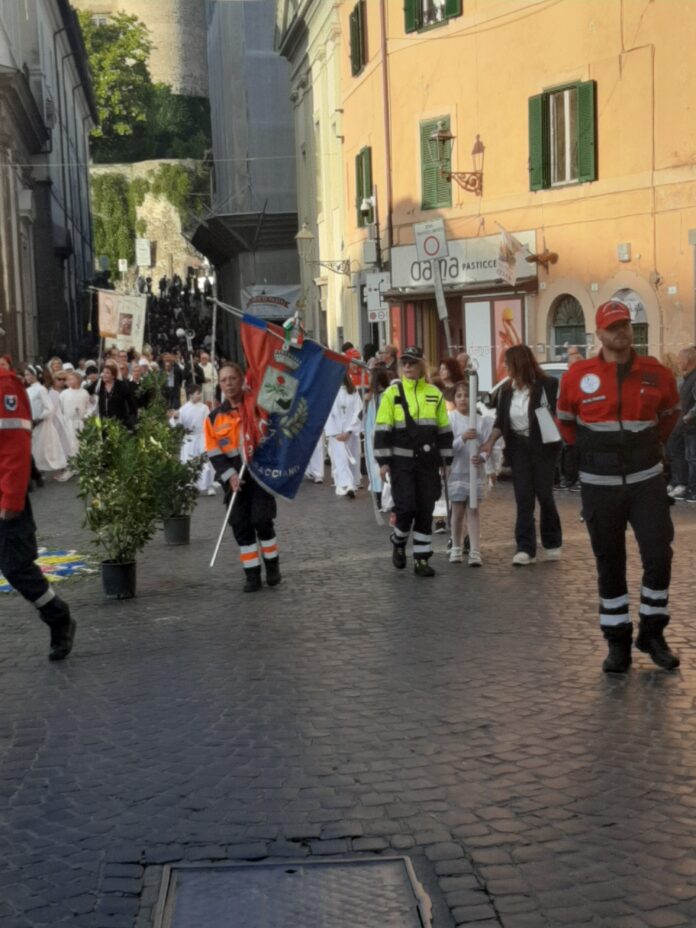 La pioggia quest’anno non è riuscita a rovinare a Bracciano la realizzazione della tradizionale Infiorata, che fa da cornice alla solennità del Corpus Domini da più di quarant’anni. Così sotto il coordinamento delle maestranze del Rione Borgo, primi e originari ideatori dell’atteso appuntamento, un’ondata di petali colorati ha fatto da cornice al corteo processionale che, oltre le 19.30, ha iniziato a snodarsi nelle strade e nelle piazze del centro cittadino. Con il supporto degli uomini dell’associazione nazionale volontari Carabinieri Protezione Civile, la processione partendo dal Duomo Santo Stefano P.M. ha attraversato via Umberto I per poi sostare in Piazza IV Novembre, davanti all’ingresso del Municipio, dove anche gli esponenti dell’amministrazione comunale hanno fatto trovare un piccolo quadro floreale, successivamente i fedeli hanno raggiunto con il Santissimo piazza Dante, per un’altra sosta di preghiera e adorazione di fronte alla scuola elementare Tommaso Tittoni e anche qui fiori e disegni in terra. Successivamente la processione si è in camminata verso via Salvatore Negretti, la via principale dell’Infiorata, rallegrata da un susseguirsi di colori e disegni, frutto del sapiente e meticoloso lavoro di decine di persone di ogni età, che dalle prime ore del mattino chini sulla strada hanno accostato petali, riso, sale e segatura per comporre al meglio i diversi ed originali disegni ideati per l’occasione. L’infiorata ha visto anche quest’anno l’impegno allegro e congiunto di numerose associazioni ed enti quali: Arvas- San Vincenzo, Unitalsi, la scuola primaria dell’ic Bracciano, rappresentata dalla classe 5D, i gruppi parrocchiali del catechismo, il gruppo Camminare per unire, i Rioni Cartiere e Monti, la pro loco, le parrocchie di Vigna di Valle e Bracciano nuova, La Misericordia, i vari gruppi del Rione Borgo, il gruppo scout Bracciano e il gruppo della Cresima. La conclusione della processione del Corpus Domini al convento del Divino Amore e la benedizione finale hanno suggellato una giornata dove tradizione, fede, impegno sociale e divertimento hanno saputo incontrarsi animando la città di Bracciano.