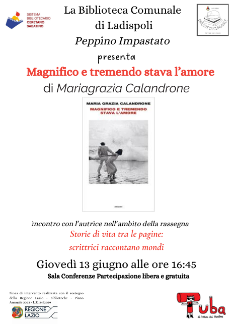 Proseguono in Biblioteca gli incontri della rassegna Storie di vita tra le pagine: scrittrici raccontano mondi: vi aspettiamo giovedì 13 giugno alle ore 16:45, con Maria Grazia Calandrone e il suo ultimo libro “Magnifico e tremendo stava l’amore”.