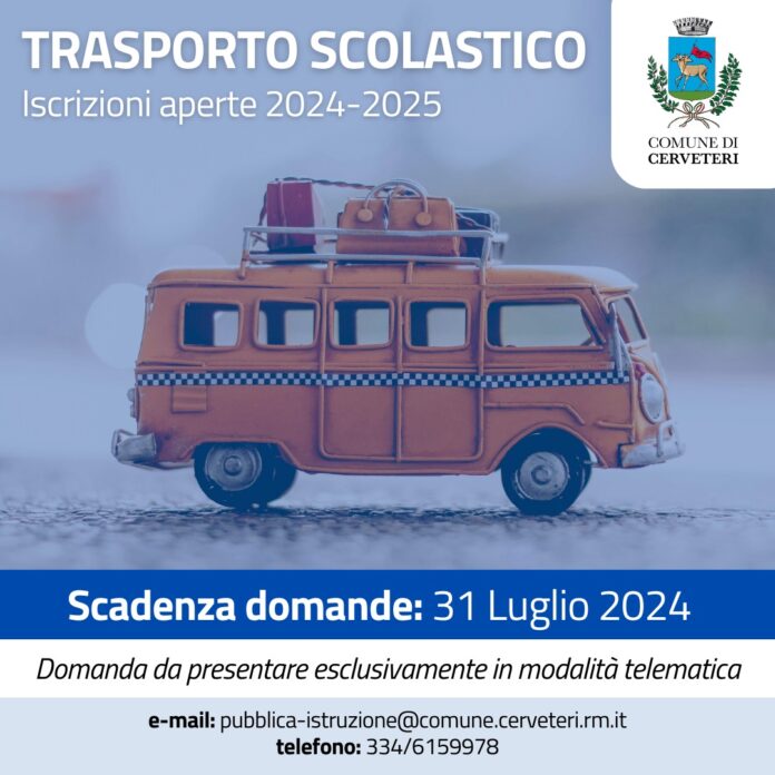 Il Sindaco di Cerveteri Elena Gubetti rende noto che sono aperte le iscrizioni al servizio di trasporto scolastico per l’anno scolastico 2024/2025. Termine ultimo per la presentazione della domanda, quello di mercoledì 31 luglio. Le tariffe del servizio di trasporto scolastico sono rimaste invariate. Le famiglie con un solo figlio, pagheranno un canone annuo di 200,00 Euro, con due figli un canone annuo di 280,00 Euro, con tre o più figli di 360,00 Euro. Gli importi sono anche rateizzabili in 8 rate.