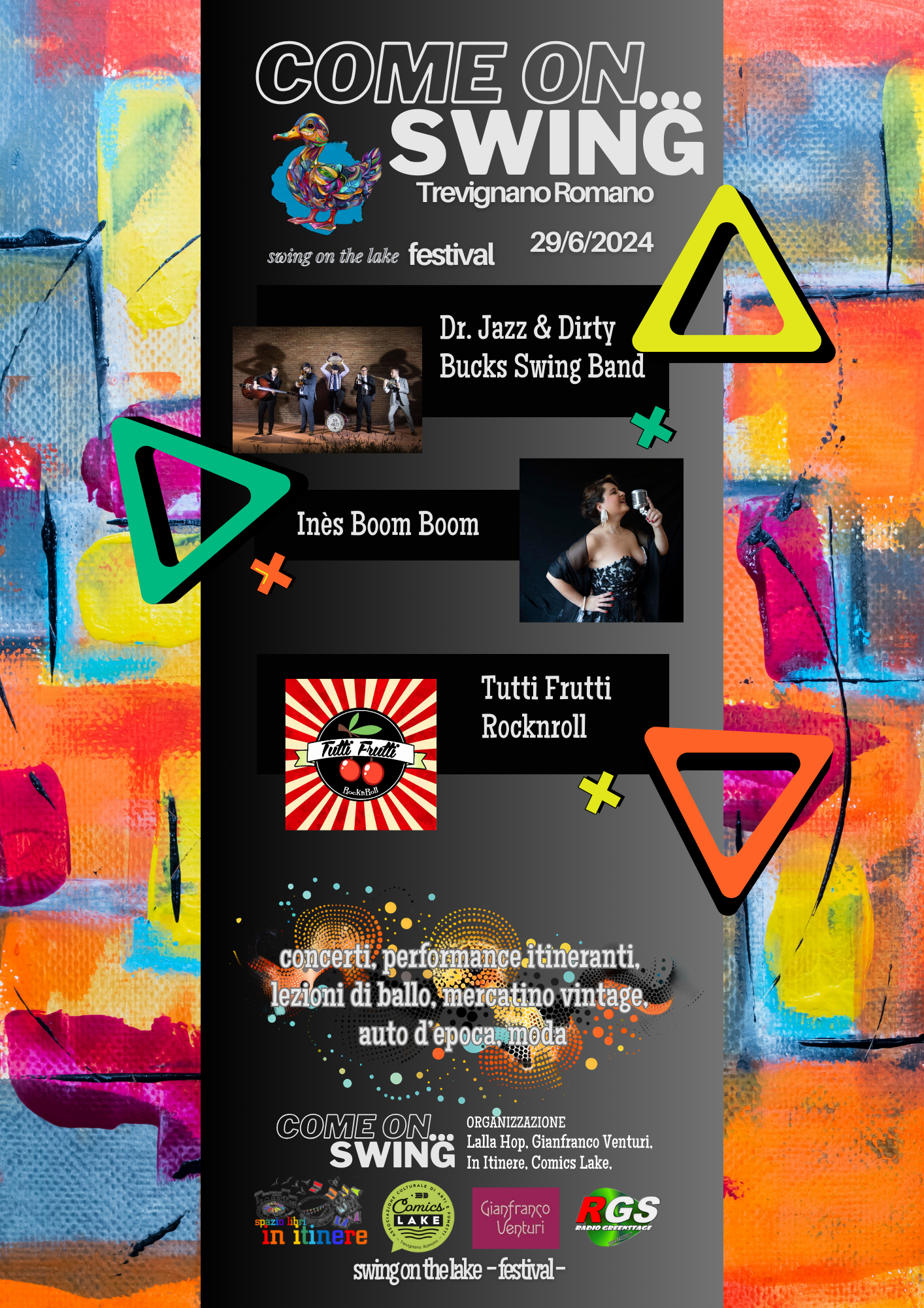 Come On… Swing, ed il suo team organizzativo costituito da Lalla Hop, Gianfranco Venturi, In Itinere e Comics Lake, con RGS come media partner, e l’accoglienza ed il sostegno del Comune di Trevignano Romano, ti aspetta per vivere una giornata da passare allegramente in compagnia con la Dr. Jazz & Dirty Bucks Swing Band, Inès Boom Boom e la Tutti Frutti Rocknroll.