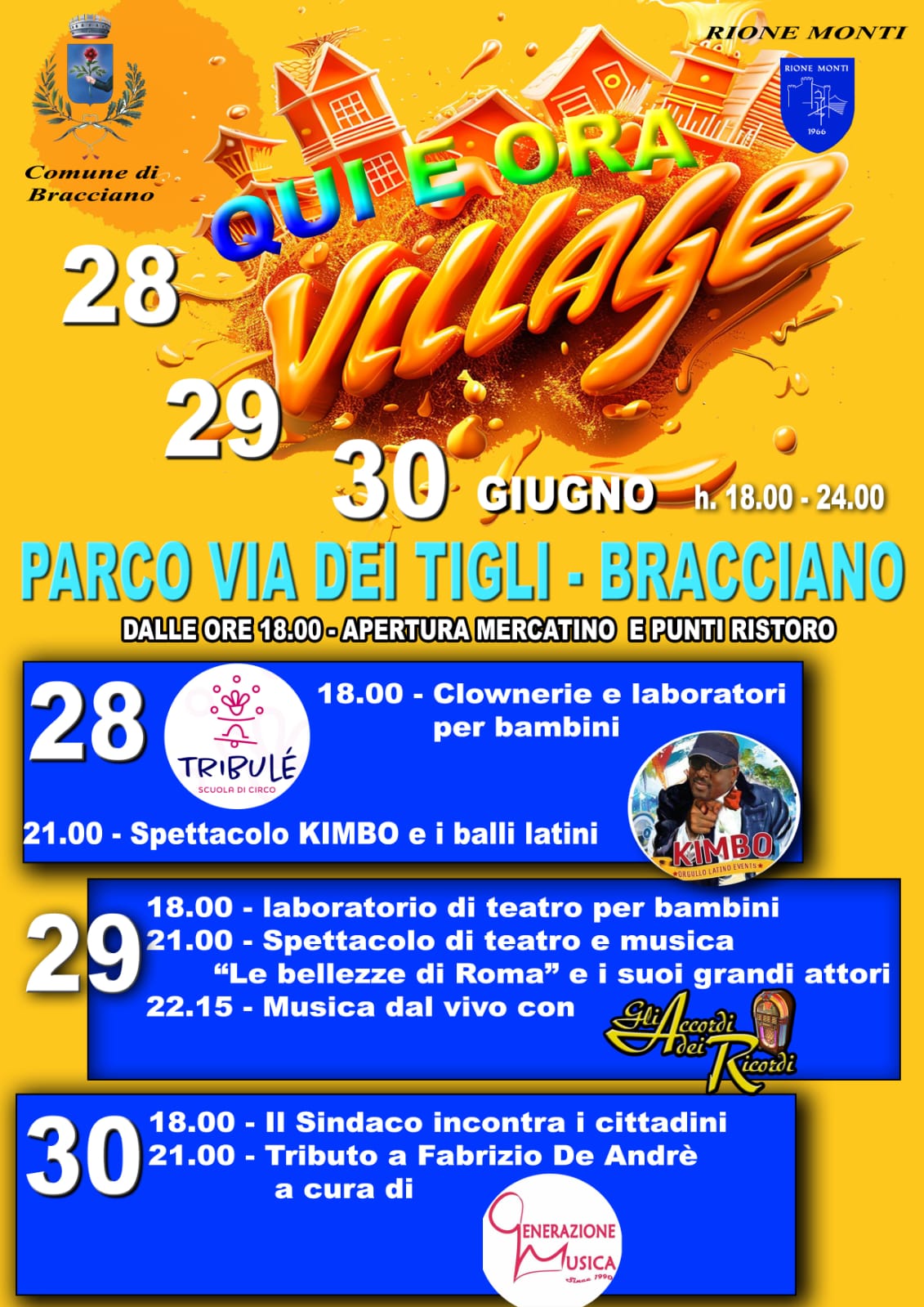 Riceviamo e pubblichiamo – L’amministrazione comunale di Bracciano è lieta di annunciare l’evento “Qui e Ora Village”, che si terrà presso il Parco Via dei Tigli dal 28 al 30 giugno 2024, dalle ore 18:00 alle 24:00. Questo evento rappresenta un’importante occasione di incontro e divertimento per tutta la comunità, con un ricco programma di attività pensate per tutte le età.
