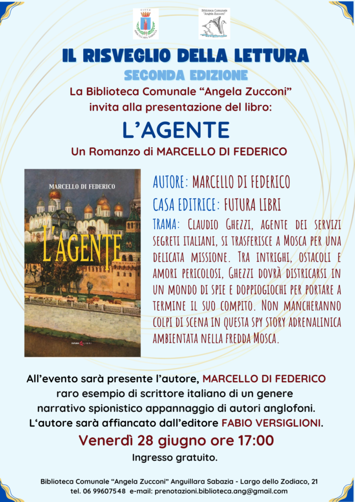 Venerdì 28 giugno alle ore 17, la biblioteca comunale “Angela Zucconi” di Anguillara ospiterà la presentazione del romanzo thriller spionistico “L’agente” di Marcello Di Federico.