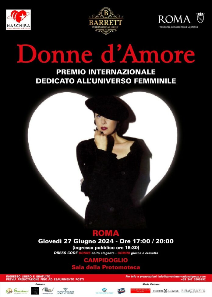 Giovedì, 27 giugno dalle 17 in Campidoglio (Sala della Protomoteca) a Roma, si svolgerà l’Evento “Donne D’Amore – Premio Internazionale dedicato all’Universo Femminile, promosso da Fabrizio Santori, Consigliere Capitolino e Segretario d’Aula dell’Assemblea Capitolina, e organizzato dall’Associazione Naschira, partner di Barrett International Group di Virginia Barrett, operante da tempo sul territorio Nazionale ed Internazionale in ambito sociale e culturale. Premiati d’eccezione l’attrice Daniela Poggi e l’attore Walter Nudo.