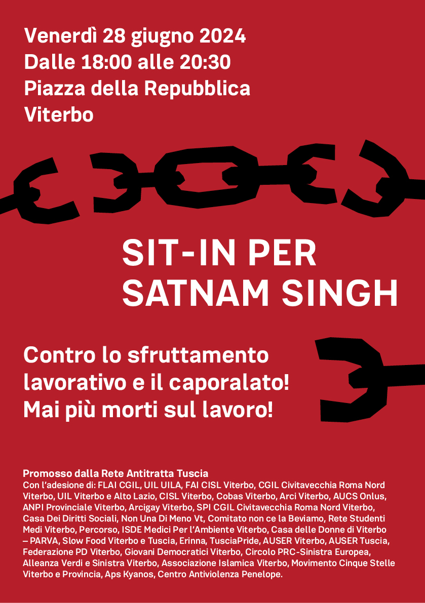 Oggi a partire dalle 18 e fino alle 20 e 30 a Viterbo, Piazza della Repubblica è indetto un sit-in per per Satnam Singh.