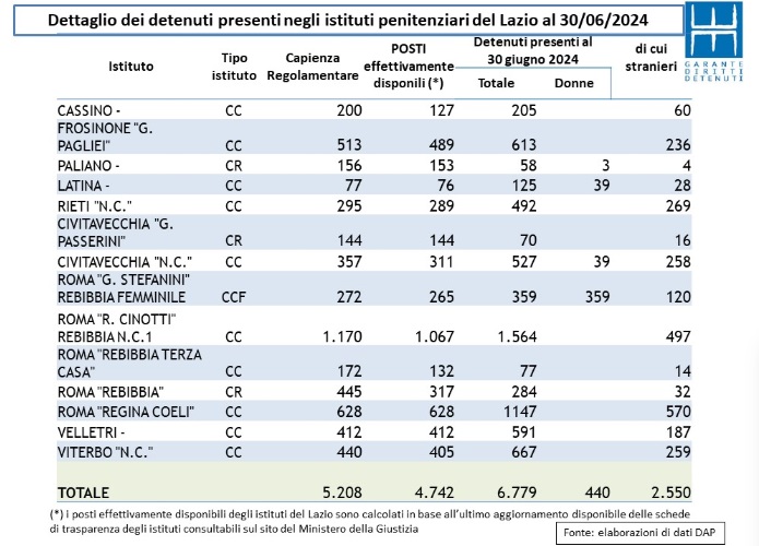 Secondo i dati del Dipartimento dell’amministrazione penitenziaria (Dap) diffusi dal ministero della Giustizia, alla fine di giugno il numero di detenuti presenti negli istituti penitenziari del Lazio è stato pari a 6.778 con un incremento di 251 unità rispetto ai 6.537 di inizio anno. In termini percentuali il tasso di crescita nei primi sei mesi dell’anno è stato del 3,8% ed è superiore alla media nazionale.