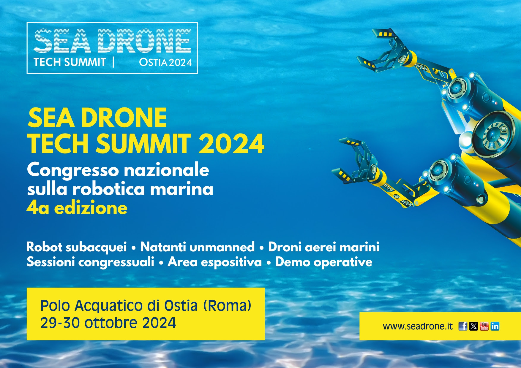 Torna “Sea Drone Tech Summit 2024”, quarta edizione del congresso nazionale sulla robotica marina. L’evento, che si svolgerà nei giorni 29 e 30 ottobre presso il Polo Acquatico della Federazione Italiana Nuoto a Ostia (Roma), è organizzato dall’associazione culturale Ifimedia e da Mediarkè, in collaborazione con il Municipio X del Comune di Roma, il Dipartimento di Ingegneria Industriale, Elettronica e Meccanica (DIIEM) dell’Università Roma Tre, l’Interuniversity Center of Integrated Systems for the Marine Environment (ISME) e il Cluster Tecnologico Nazionale Blue Italian Growth (Cluster BIG).