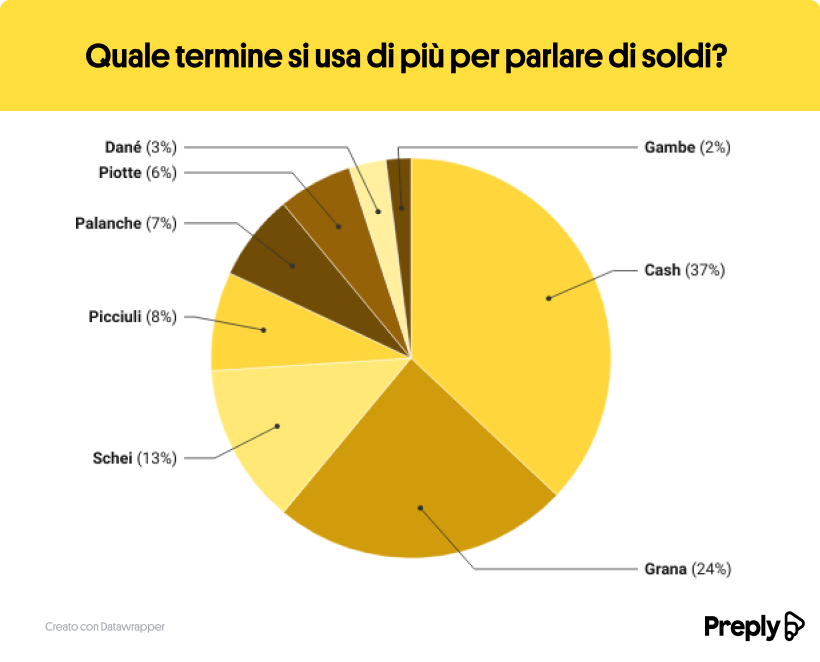 Parlando di denaro, nello studio realizzato da Preply l’inglese “cash” (37%) guida la classifica tra i millennials, riflettendo l’influenza globale sulla nostra lingua. D’altra parte, “Grana” (24%), con le sue radici nella lavorazione del grano, è più comunemente adottato dalle generazioni più adulte. È interessante notare che in varie regioni italiane persiste l’uso di espressioni dialettali come “Schei” nel Veneto, “Picciuli” in Sicilia, “Palanche” in Liguria e “Piotte” nel Lazio per descrivere il denaro, riflettendo la ricca diversità linguistica del paese.