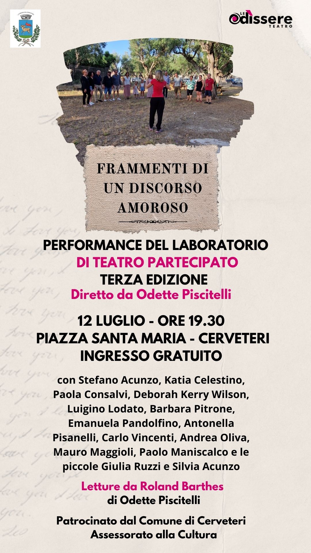Venerdì 12 luglio, in Piazza Santa Maria a Cerveteri – ore 19:30 – andrà in scena la performance conclusiva della terza edizione del laboratorio di teatro partecipato “Frammenti di un discorso amoroso”, organizzato da Le Odìssere Teatro, in collaborazione con CDM-Campo di Mare Teatro Festival e patrocinato dal Comune di Cerveteri , assessorato alla cultura.