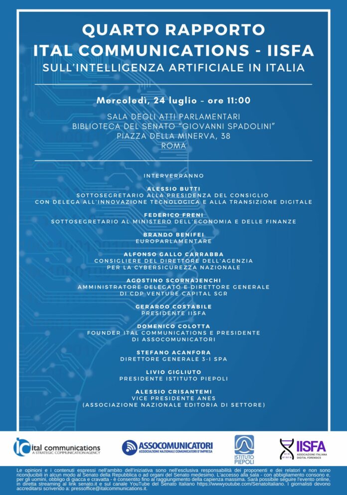 Mercoledì 24 luglio, alle ore 11.00, nella Sala degli Atti parlamentari presso la Biblioteca del Senato “Giovanni Spadolini” in Piazza della Minerva, 38, a Roma, verrà presentato il Quarto Rapporto sull’Intelligenza Artificiale in Italia realizzato da Ital Communications e IISFA (Associazione Italiana Digital Forensics) in collaborazione con Istituto Piepoli.
