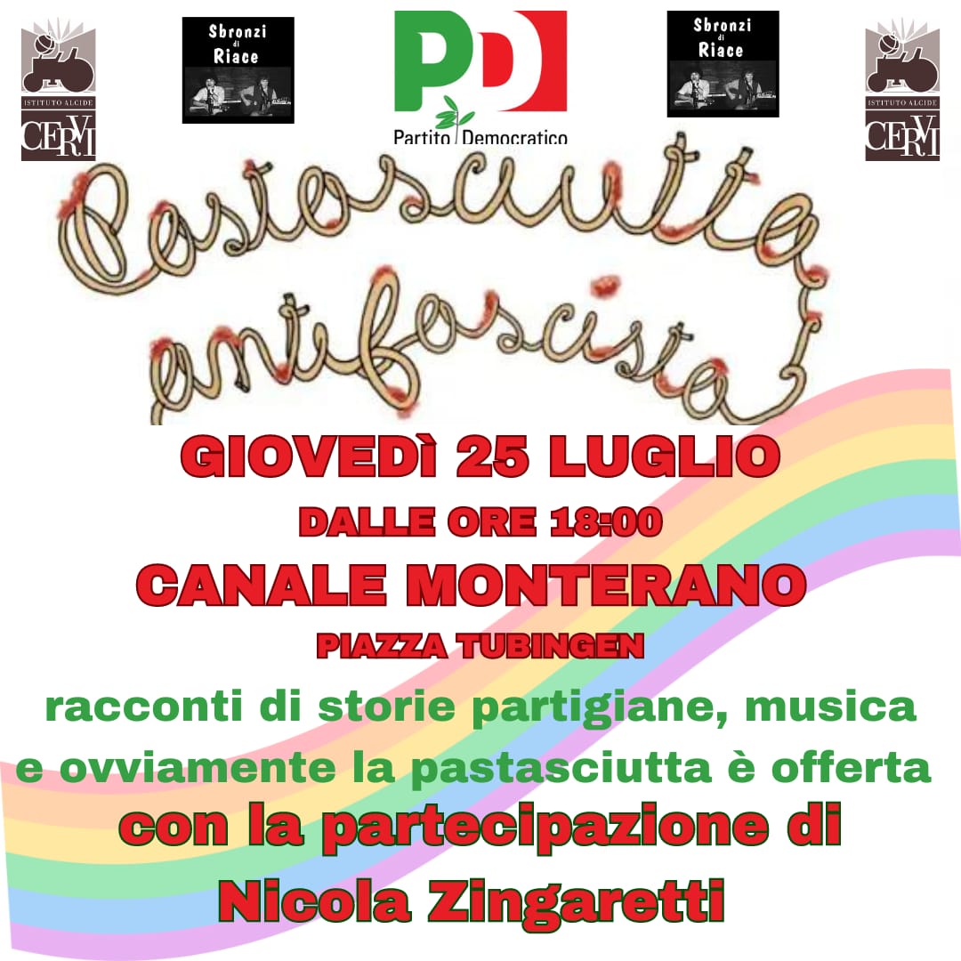 L’ iniziativa è registrata nella rete nazionale delle pastasciutte antifasciste dell’istituto Cervi, si svolgerà giovedì 25 luglio dalle ore 18:00 a Canale Monterano in P.zza Tubingen.