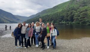 La seconda tappa ha portato il gruppo a Glendalough, in una splendida valle di origine glaciale, nel cuore della contea di Wicklow, dove, nel VI secolo, uno dei santi più venerati d’Irlanda, St. Kevin, fondò un monastero che, in poco tempo, si trasformò in uno dei centri religiosi più famosi d’Europa. I resti di questa antica città monastica sono disseminati nella valle, incorniciata da due specchi d’acqua e circondata da pendii verdeggianti ricoperti di larici e abeti. Dopo una bellissima passeggiata tra la lussureggiante vegetazione è stata raggiunta la fresca cascata di Poulanass.