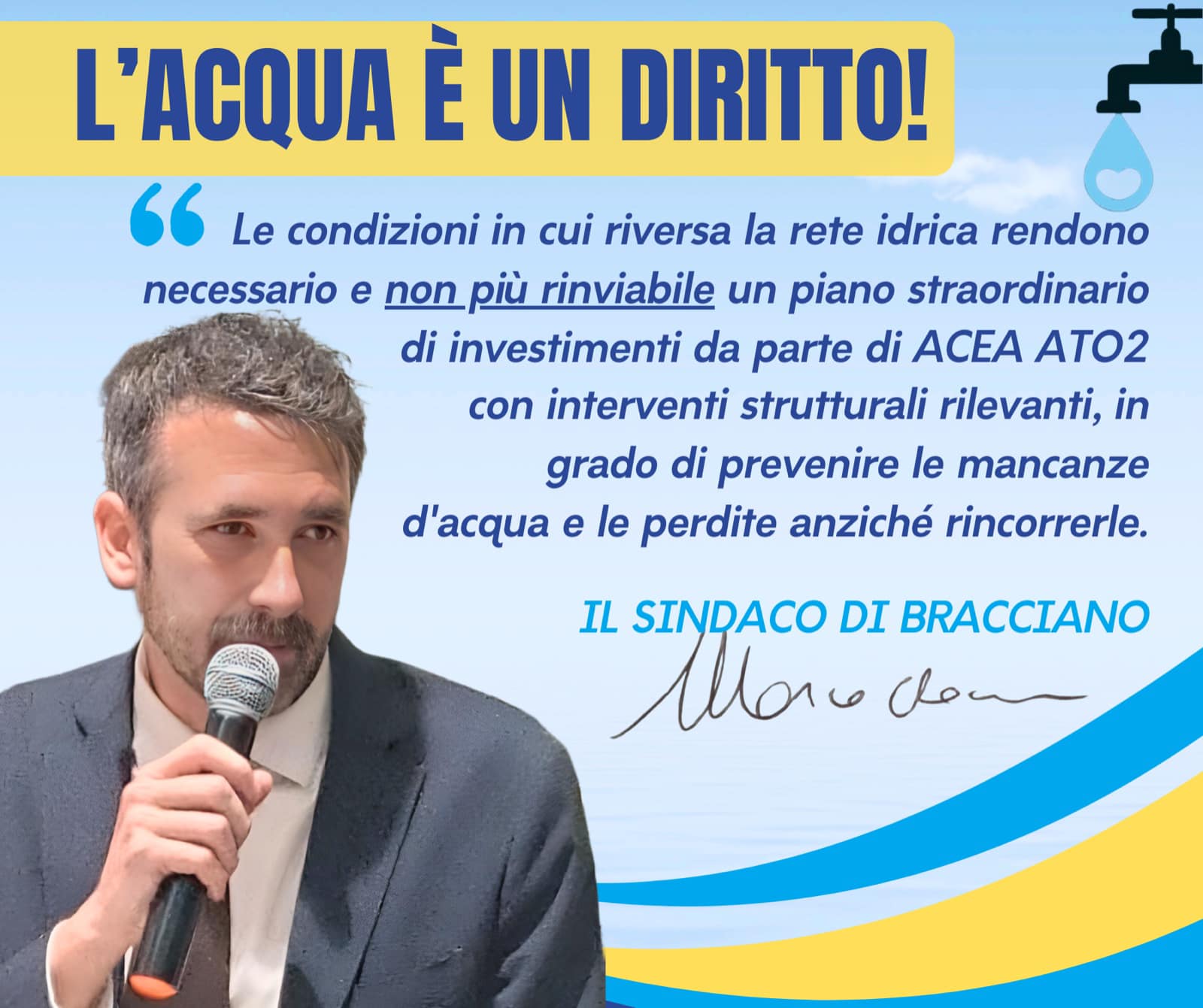 Riceviamo e pubblichiamo – Durante la conferenza dei Sindaci con Acea Ato2, ho rappresentato con fermezza la posizione del Comune di Bracciano riguardo ai numerosi disagi segnalati dai cittadini, sottolineando l’urgente necessità di interventi risolutivi per le problematiche che affliggono la nostra comunità, ribadendo la necessità di un cambio di passo nella gestione del servizio idrico.