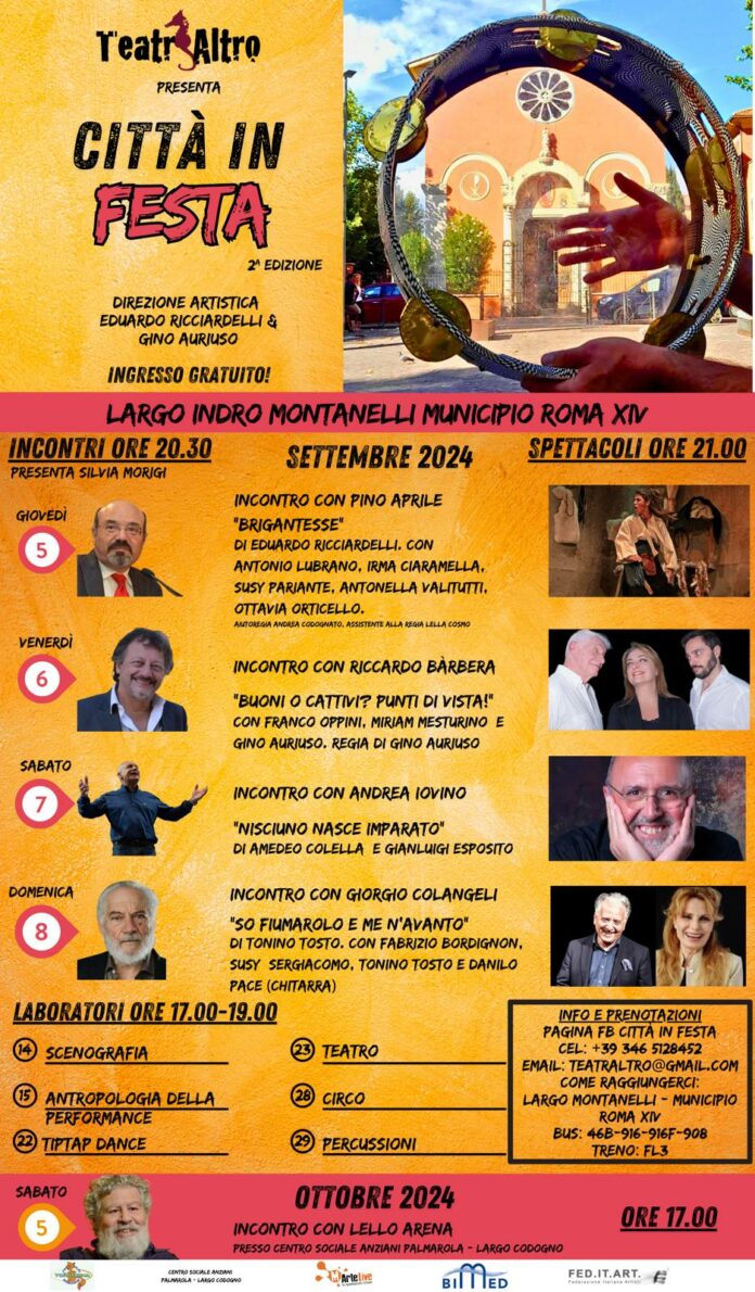 Conto alla rovescia per la seconda edizione di “Città in festa”, iniziativa culturale che verso il calare dell’estate andrà in scena nel cuore del XIV municipio, a largo Indro Montanelli. Per la cronaca si tratta di una serie di eventi realizzati sotto la direzione artistica di Eduardo Ricciarelli e Gino Auriuso, tutti a ingresso gratuito, e il via è fissato per giovedi 5 settembre con “Brigantesse”, spettacolo che vedrà sul palco lo stesso Ricciardelli e con lui Antonio Lubrano, Irma Ciaramella, Susy Parlante, Antonella Valitutti e Ottavia Orticello. Lo spettacolo avrà inizio alle 21 e sarà preceduto (alle 20.30) da un incontro con Pino Aprile.