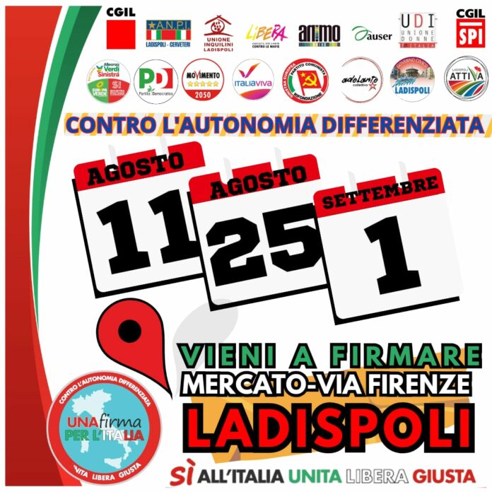 Riceviamo e pubblichiamo – Il 19 luglio si è costituito il Coordinamento territoriale per il Referendum Abrogativo dell’autonomia differenziata ( https://trcgiornale.it/raccolta-firme-a-ladispoli-contro-autonomia-differenziata/ ).