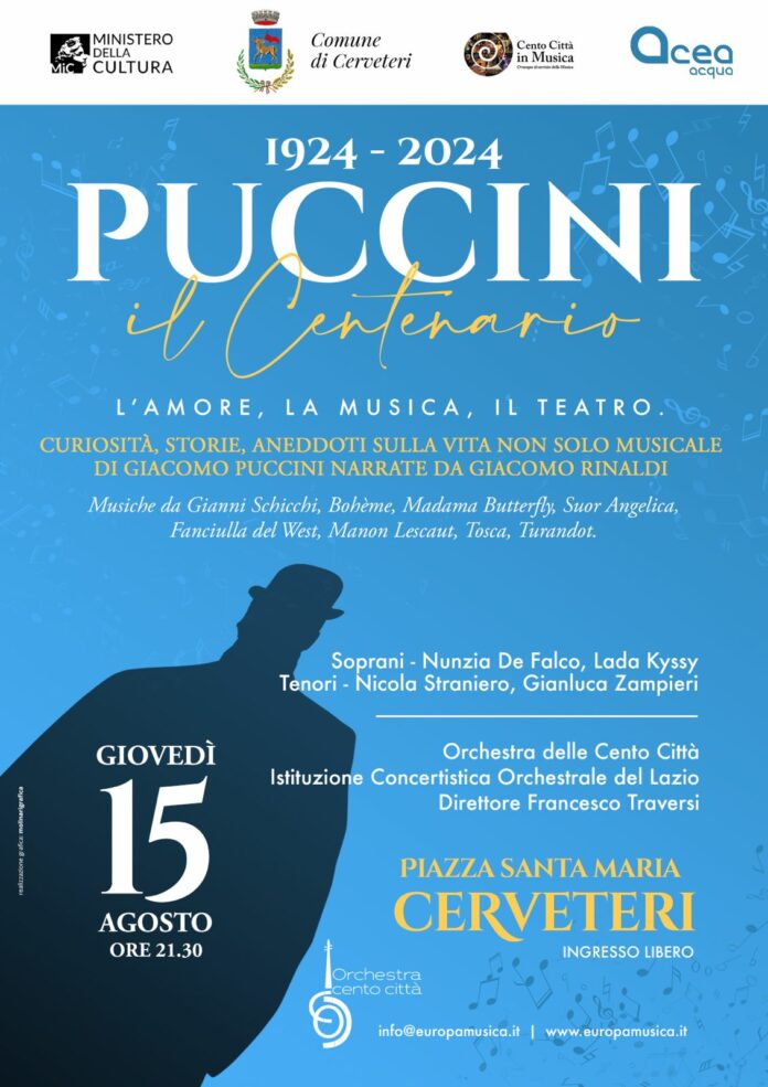 In occasione dei cento anni dalla scomparsa di Giacomo Puccini, uno dei maggiori e più significativi operisti di tutti i tempi, Cerveteri gli rende omaggio con una serata straordinaria che vedrà protagonista l’Orchestra delle Cento Città in Musica, sotto la direzione del Maestro Francesco Traversi. La direzione artistica è affidata a Eugenio Falanga, mentre l’organizzazione dell’evento è di Renzo Renzi.