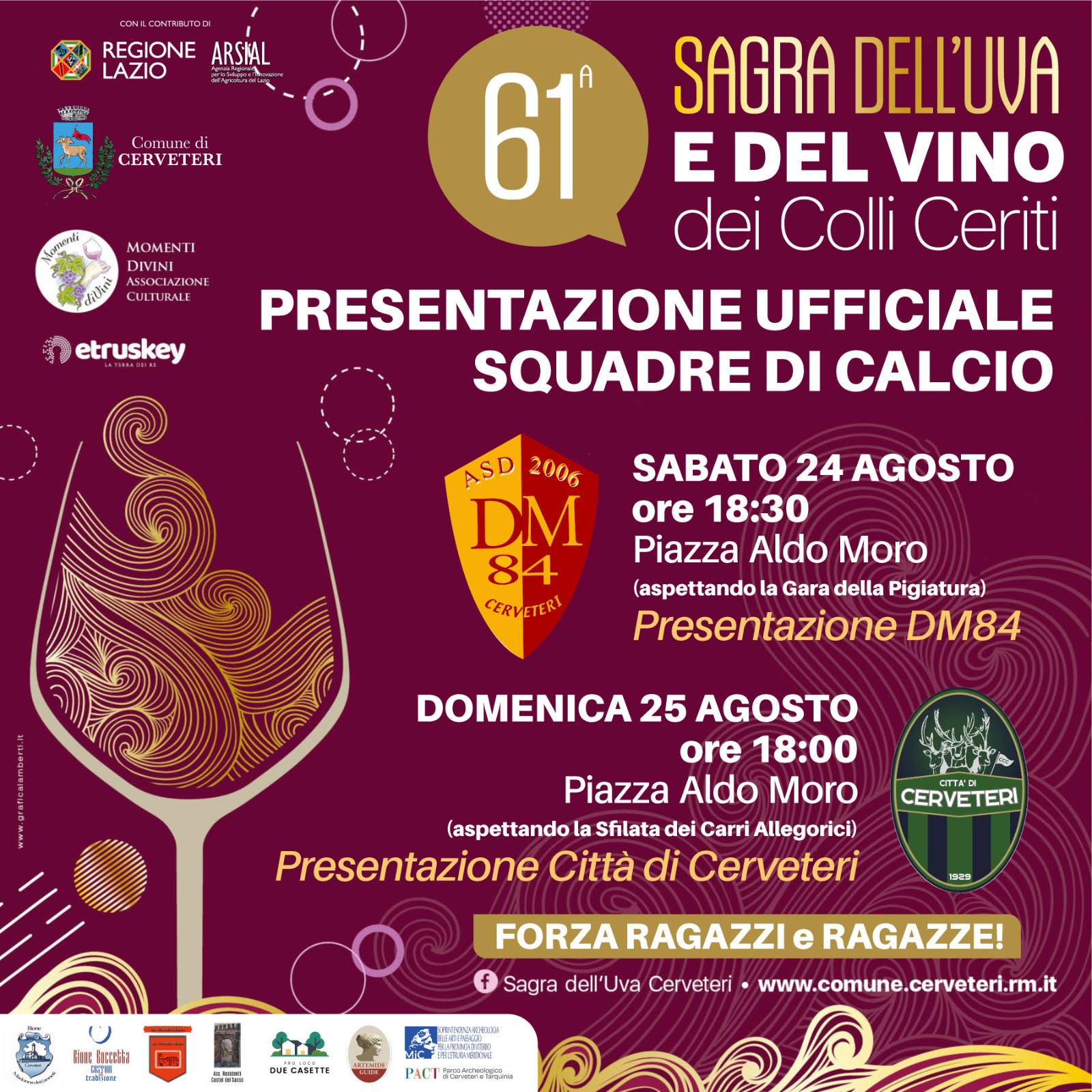 “La prima grande festa sarà per la Dm84, al suo esordio sul palco della Sagra dell’Uva, oltre agli auguri per l’avvio della nuova stagione, alla presenza della Presidente della Consulta della Sport Roberta Mariani, ricorderemo insieme al loro Presidente Piero Mataloni, la straordinaria cavalcata che li ha visti protagonisti lo scorso anno culminata con la promozione in Prima Categoria – ha dichiarato il Sindaco di Cerveteri Elena Gubetti – un traguardo importante per i ragazzi della Dm84, che li ha visti vincitori anche del premio disciplina, un grande gruppo unito dai sani valori dello sport nel ricordo di Daniele Mataloni, ragazzo di Cerveteri mai dimenticato. Con loro, l’appuntamento è per sabato 24 agosto alle ore 18:30, poco prima della gara della pigiatura”.