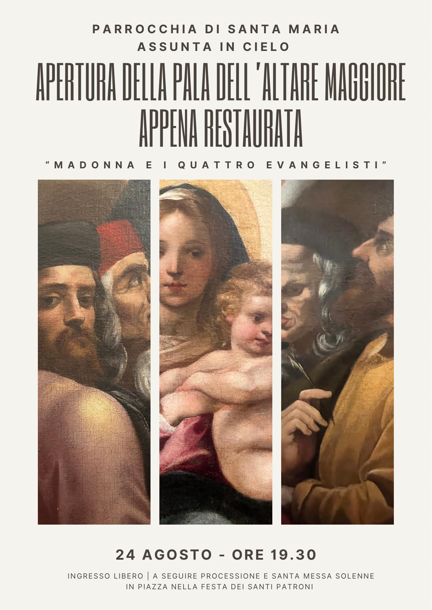 19.30 Inaugurazione della Pala d’Altare restaurata presso la Chiesa di S. Maria Assunta. A seguire Processione e Messa con il Vescovo Monsignor Marco Salvi in Piazza del Campo.