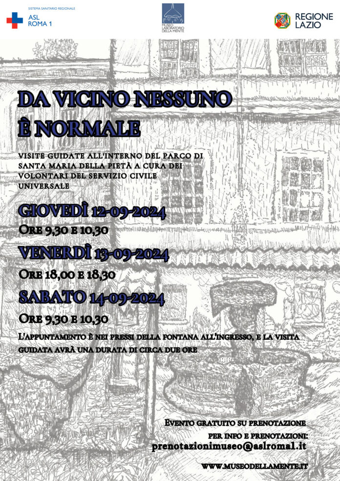 Nelle giornate del 12, 13 e 14 settembre 2024, presso il Comprensorio Santa Maria della Pietà di Roma, si terranno delle visite guidate gratuite a cura dei volontari del Servizio Civile Universale in vista della conclusione dell’esperienza svolta nei progetti del Laboratorio Museo della Mente dell’ASL Roma1: Raccontare il patrimonio, educare alla salute e La Valorizzazione delle fonti documentali a servizio della salute mentale.