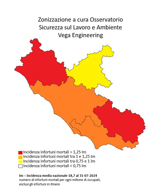 La zona arancione, quella in cui si trova il Lazio, è la zona che raggruppa le regioni con un’incidenza di mortalità sul lavoro più elevata rispetto al valore medio nazionale. A fine luglio 2024, il rischio di infortunio mortale in regione (20,2 morti per milione di occupati) risulta superiore a quello medio nazionale (18,7).
