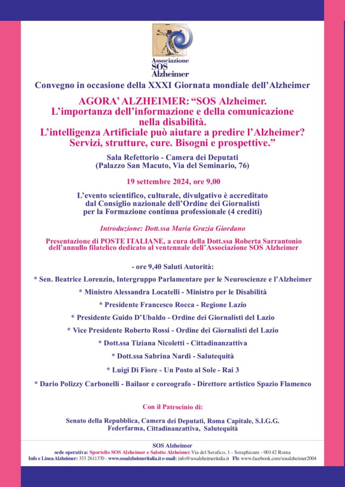 “SOS Alzheimer. L’importanza dell’informazione e della comunicazione nella disabilità. L’intelligenza Artificiale può aiutare a predire l’Alzheimer? Servizi, strutture, cure. Bisogni e prospettive” è il tema del convegno in programma giovedì 19 settembre, dalle 9, a Roma, nella Sala Refettorio della Camera dei deputati.