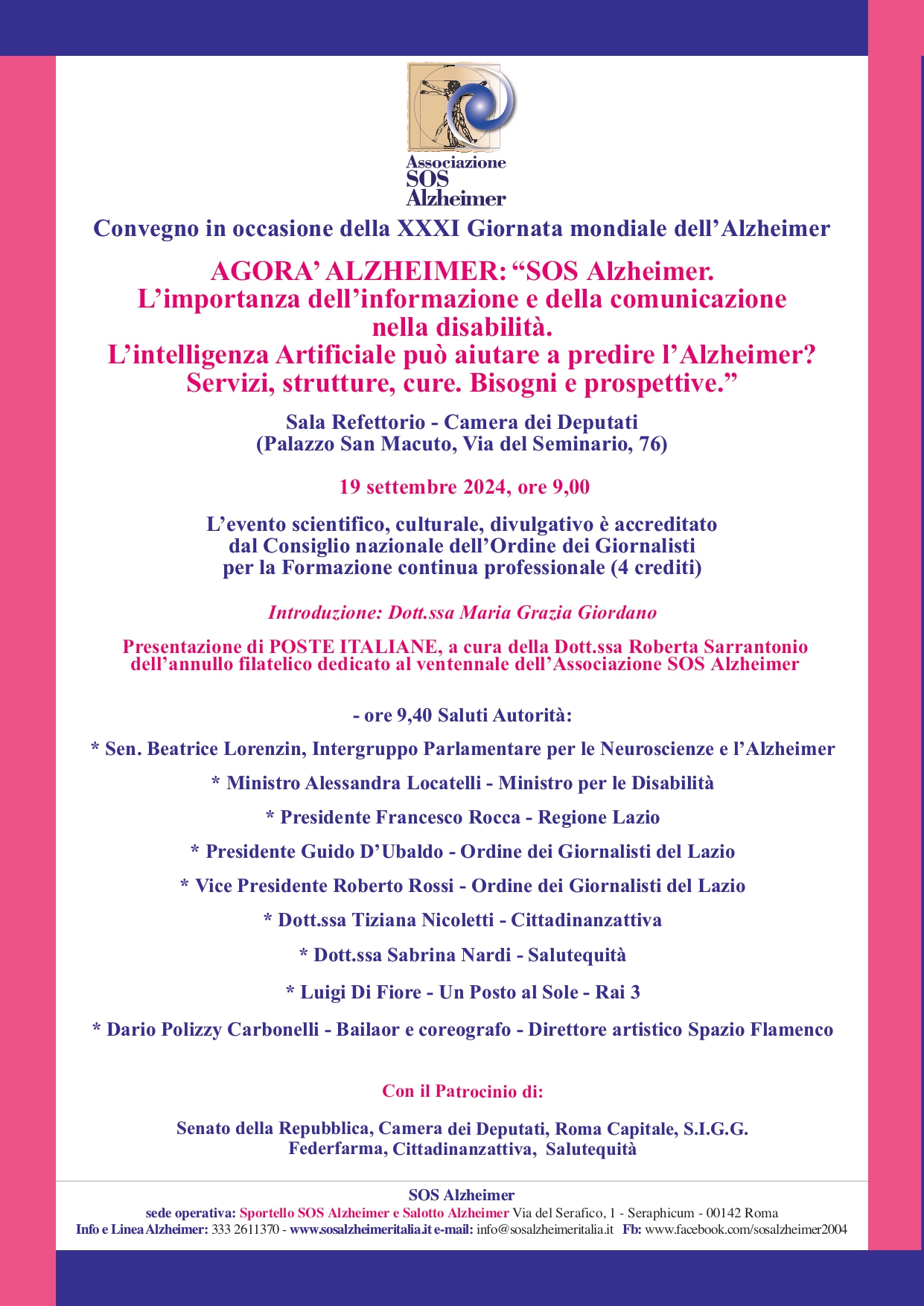 Il convegno prevede due panel scientifico-culturali. Il primo per descrivere la malattia, le possibili cause, le cure, moderato dalla Prof.ssa Rosalba Benvenuto ed il secondo sull’applicazione dell’A.I. in medicina e sulle tecniche di stimolazione cognitiva a sostegno dei malati, condotto dal giornalista Fabrizio de Jorio. Infine, una novità assoluta per i Convegni organizzati da SOS Alzheimer: un Tavolo istituzionale di confronto sui servizi e sulle strutture necessari a corrispondere alle esigenze dei malati e dei familiari. Moderato dal giornalista Antonio Ranalli, si siederanno al tavolo l’Assessore all’Inclusione sociale e Servizi alla persona della Regione Lazio, Massimiliano Maselli, il rappresentante dell’assessorato ai servizi sociali del comune di Romano, Emiliano Monteverde, il vicepresidente vicario di Federfarma, Alfredo Procaccini, e il rappresentante della Società Italiana di Geriatria e Gerontologia, Dario Leosco. Un’agorà fatta di concretezza dove la politica, la medicina, le strutture pubbliche e private del territorio si potranno incontrare e confrontarsi su proposte e progetti da introdurre a beneficio dei malati. L’iniziativa scientifica, culturale e divulgativa, per la sua valenza, è stata accreditata dall’Ordine nazionale dei Giornalisti quale Corso di formazione professionale.