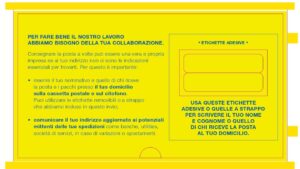 Gli interventi richiesti sono semplici: si tratta di regolarizzare le “cassette anonime” e i citofoni privi di indicazioni utilizzando le etichette adesive complete con nome e cognome di tutti i residenti. Le etichette da impiegare, a strappo e adesive, sono incluse gratuitamente nella lettera di avviso dove i cittadini sono invitati anche a comunicare, laddove se ne ravvisi la necessità, l’indirizzo aggiornato a tutti i propri mittenti abituali, in particolare i fornitori delle utenze.