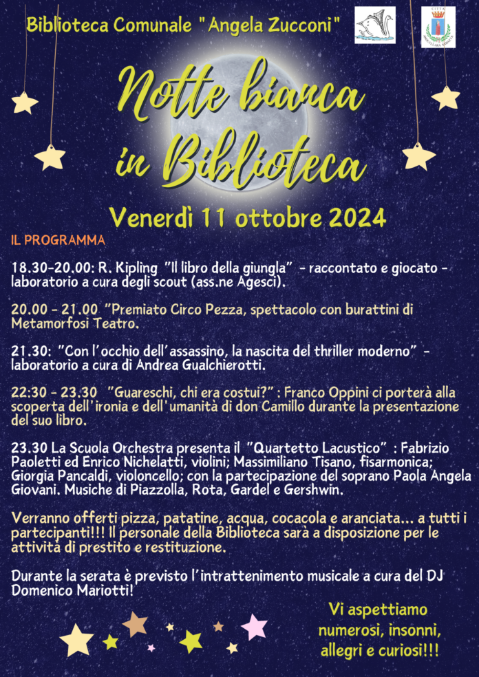 Riceviamo e pubblichiamo – L’Amministrazione Comunale è lieta di invitarvi alla “Notte bianca in biblioteca”- Una serata fuori dagli schemi dedicata a voi: i nostri appassionati Utenti, piccoli e grandi. Immergiti in un’atmosfera magica e lasciati trasportare da un ricco programma di eventi: