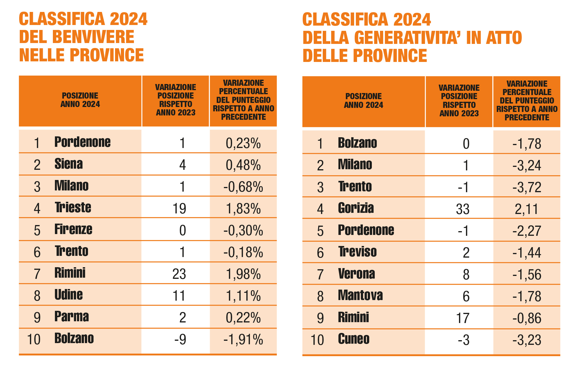 Per quanto riguarda la classifica 2024 del BenVivere, Bolzano perde, per la prima volta in sei anni, la prima posizione sul podio, scendendo di nove gradini fino al decimo posto. Il primato dunque passa a Pordenone (+1 posizione rispetto al 2023), il secondo posto è occupato da Siena, che sale di 4 gradini e terza in classifica è Milano (+1). Nella top 10 ci sono quattro nuovi ingressi: Trieste – quarta (+19), Rimini – settima (+23), Udine – ottava (+11), Parma – nona (+2). Ad uscirne, invece, sono le province di Bologna (-3), Prato (-8), Gorizia (-3) e Ancona (-11). A completare la top 10 Firenze (stabile al quinto posto) e Trento in sesta posizione (+1).