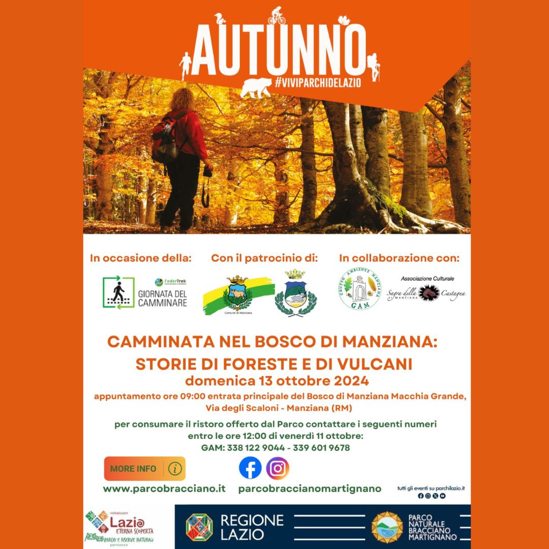 In occasione della Giornata nazionale del camminare di Federtrek, il Parco Bracciano-Martignano con il patrocinio del Comune di Manziana e dell’Università Agraria Manziana, in collaborazione con il Gruppo ambiente Manziana (GAM) e con l’associazione sagra della Castagna di Manziana ha organizzano una camminata all’interno del Bosco Macchia Grande di Manziana.