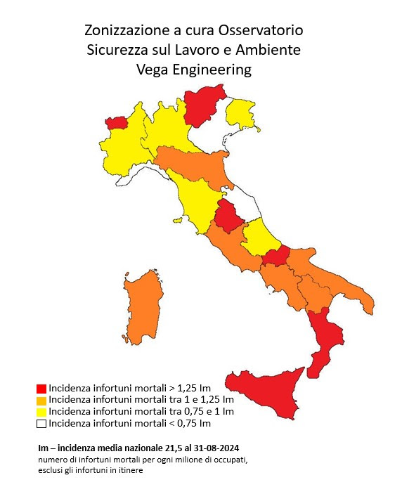 A finire in zona rossa a fine agosto 2024 con un’incidenza superiore a +25% rispetto alla media nazionale (Im=Indice incidenza medio, pari a 21,5 morti sul lavoro ogni milione di lavoratori) sono: Valle d’Aosta, Umbria, Trentino-Alto Adige, Sicilia, Molise e Calabria. In zona arancione: Emilia-Romagna, Sardegna, Basilicata, Campania, Puglia e Lazio. In zona gialla: Abruzzo, Lombardia, Toscana, Friuli-Venezia Giulia e Piemonte. In zona bianca: Veneto, Liguria e Marche.