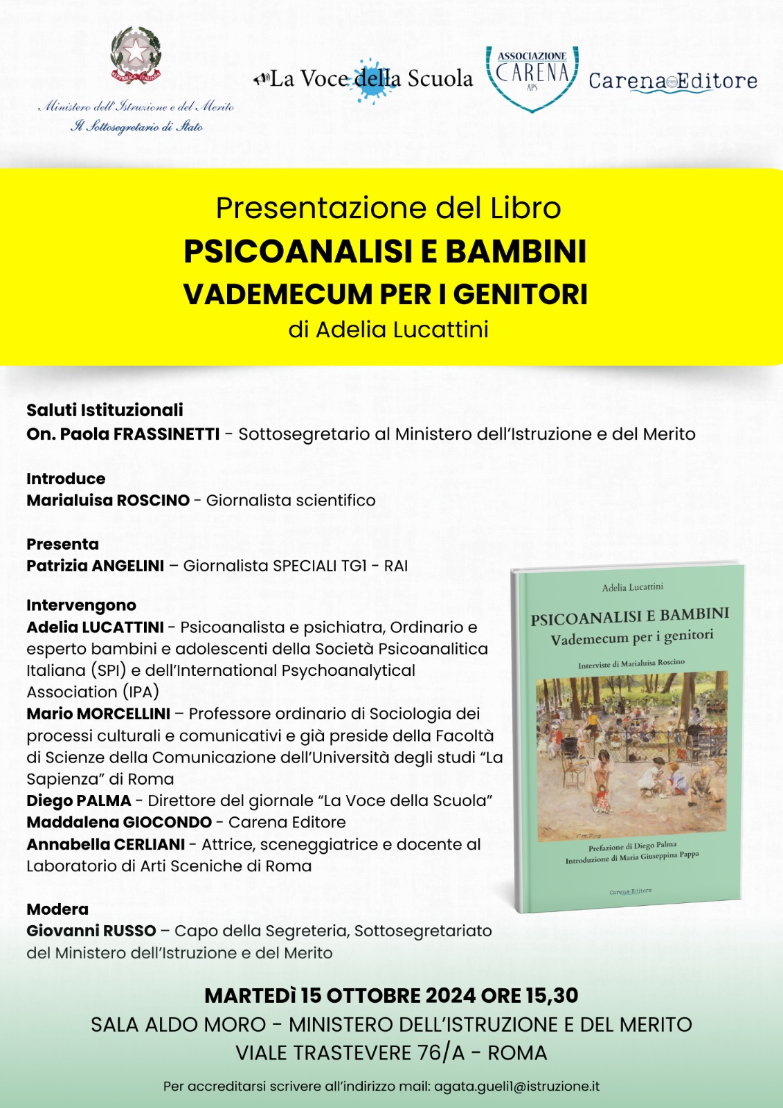 Martedì 15 ottobre, alle 15.30, a Roma, nella “Sala Aldo Moro” del Ministero dell’Istruzione e del Merito (MIM) (Viale Trastevere, 76 / A), si terrà la presentazione di “Psicoanalisi e Bambini – Vademecum per i genitori” di Adelia Lucattini, Psichiatra e Psicoanalista Ordinario della Società Psicoanalitica Italiana, che nasce dalla collaborazione con la giornalista scientifica Marialuisa Roscino. L’opera, edita da Carena Editore, si rivolge agli insegnanti, ai genitori e alle famiglie, che hanno un ruolo primario nella crescita e nello sviluppo psichico e affettivo, nonché corporeo dei propri figli.