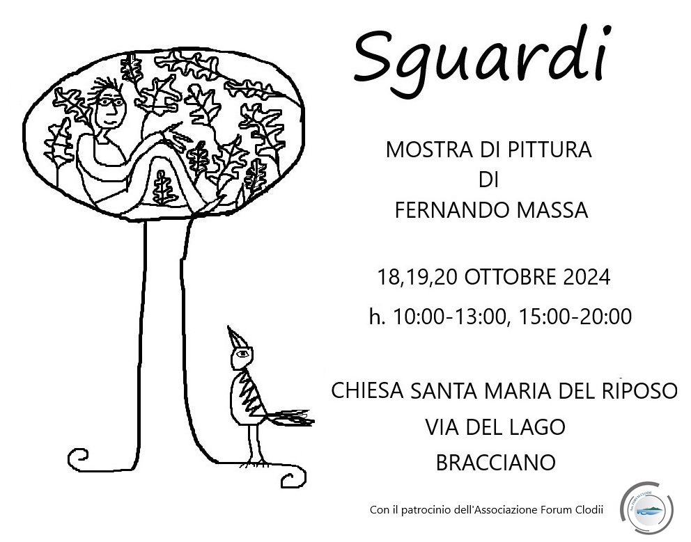 Venerdì 18 sabato 19 domenica 20 con orari 10.00 – 13.00 e 15.00 – 20.00, si terrà presso la Chiesa del Riposo, con il patrocinio dell’Associazione, una mostra di pittura dell’artista Fernando Massa dal titolo ” Sguardi”.