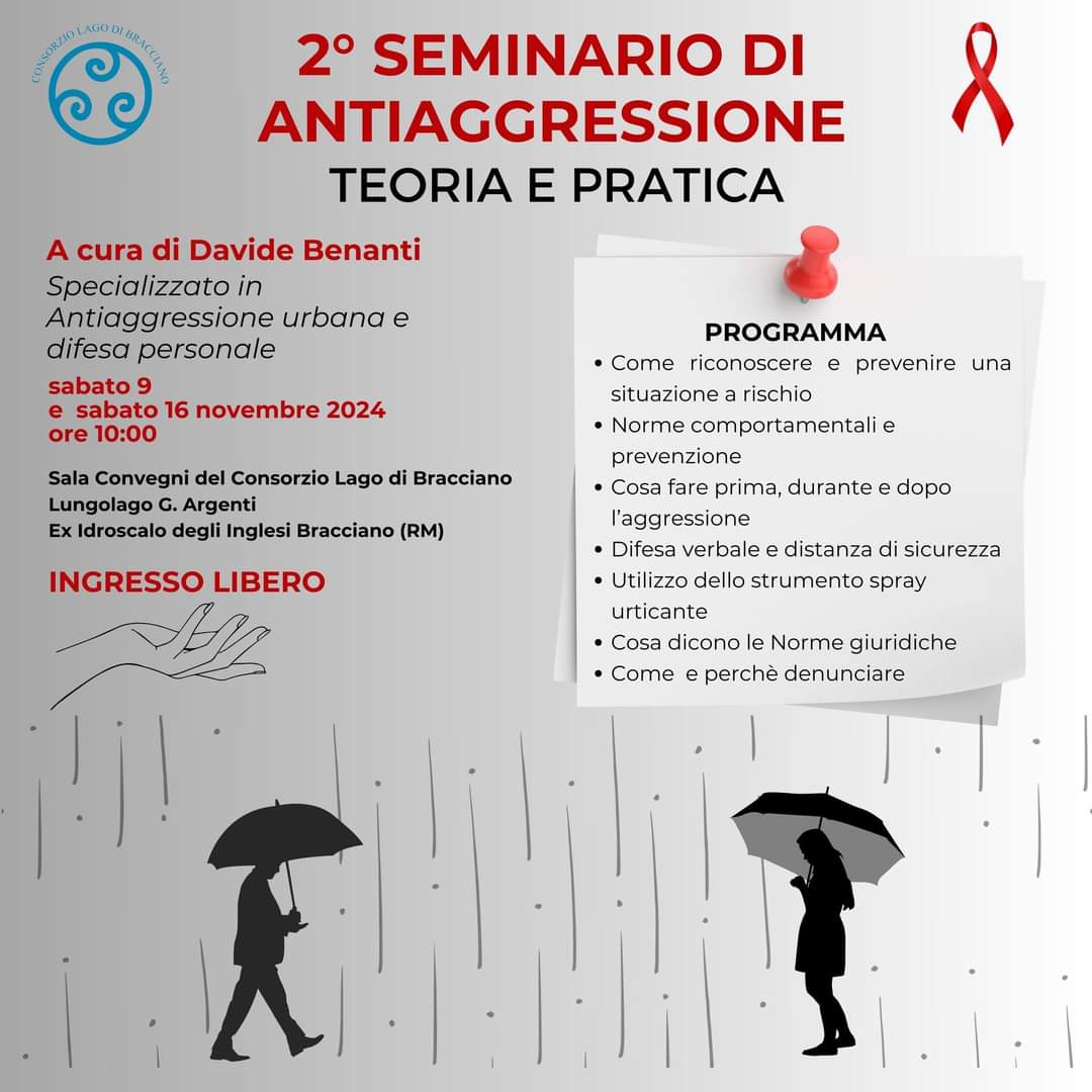 Il 25 novembre è la Giornata internazionale contro la violenza sulle donne e il Consorzio lago di Bracciano vuole continuare a dare il suo contributo organizzando sabato 9 e sabato 16 novembre 2024 alle 10 nella sala convegni della sede storica all’Idroscalo degli Inglesi, il 2° Seminario Antiaggressione – Teoria e Pratica.