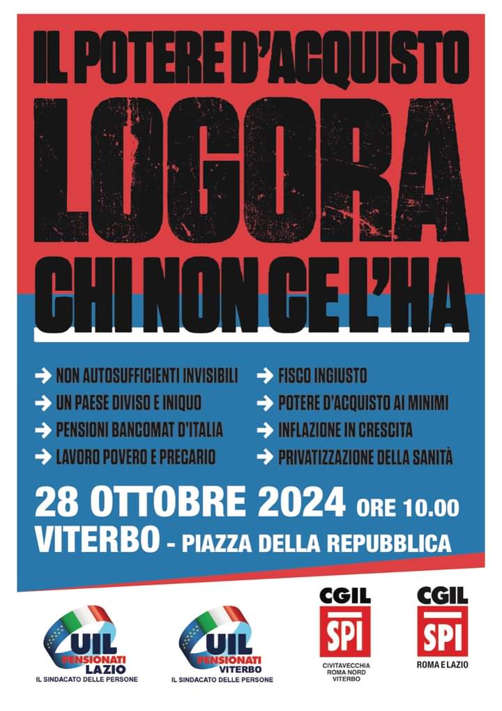 Il 28 ottobre le pensionate e i pensionati di CGIL e UIL del Lazio saranno in piazza in tutte le province della regione con lo slogan “Il potere d’acquisto logora chi non ce l’ha” per contrastare la legge di bilancio preparata dal Governo. Una legge di bilancio ancora una volta inadeguata ad affrontare le priorità delle persone e che rischia di peggiorare significativamente la condizione materiale di vita delle pensionate e dei pensionati.