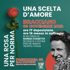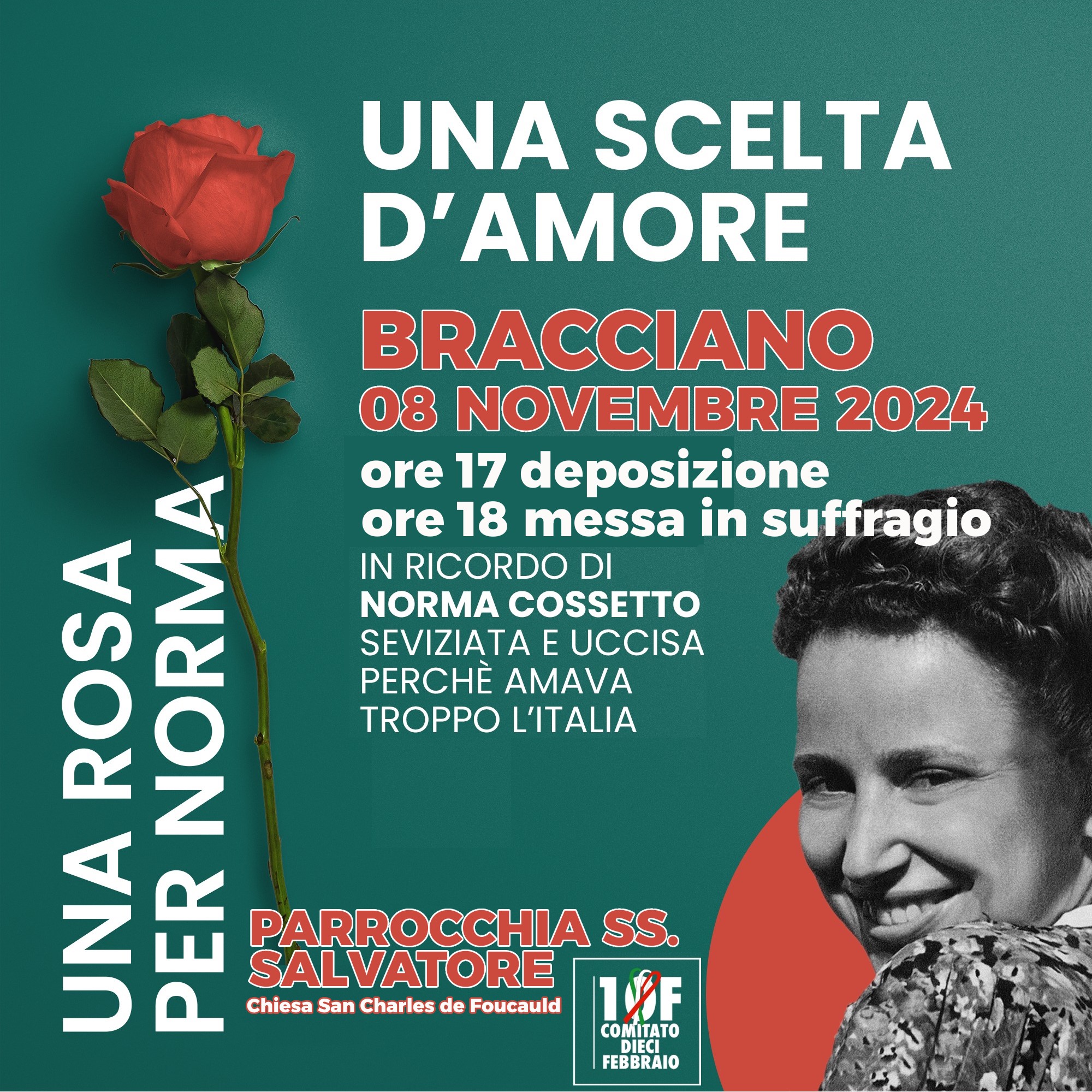 Si svolgerà il giorno 08 novembre 2024, alle ore 17, in via delle Palme, 6/B, a Bracciano, nella Parrocchia SS. Salvatore, “Una rosa per Norma Cossetto”, la