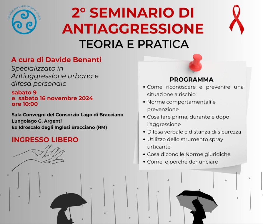 Sabato 9 e sabato 16 novembre 2024, alle ore 10:00, presso la Sala Convegni del Consorzio Lago di Bracciano, situata in via Lungolago G. Argenti (Ex Idroscalo degli Inglesi), si terrà il 2° Seminario di Antiaggressione, un evento dedicato alla prevenzione e alla difesa personale.