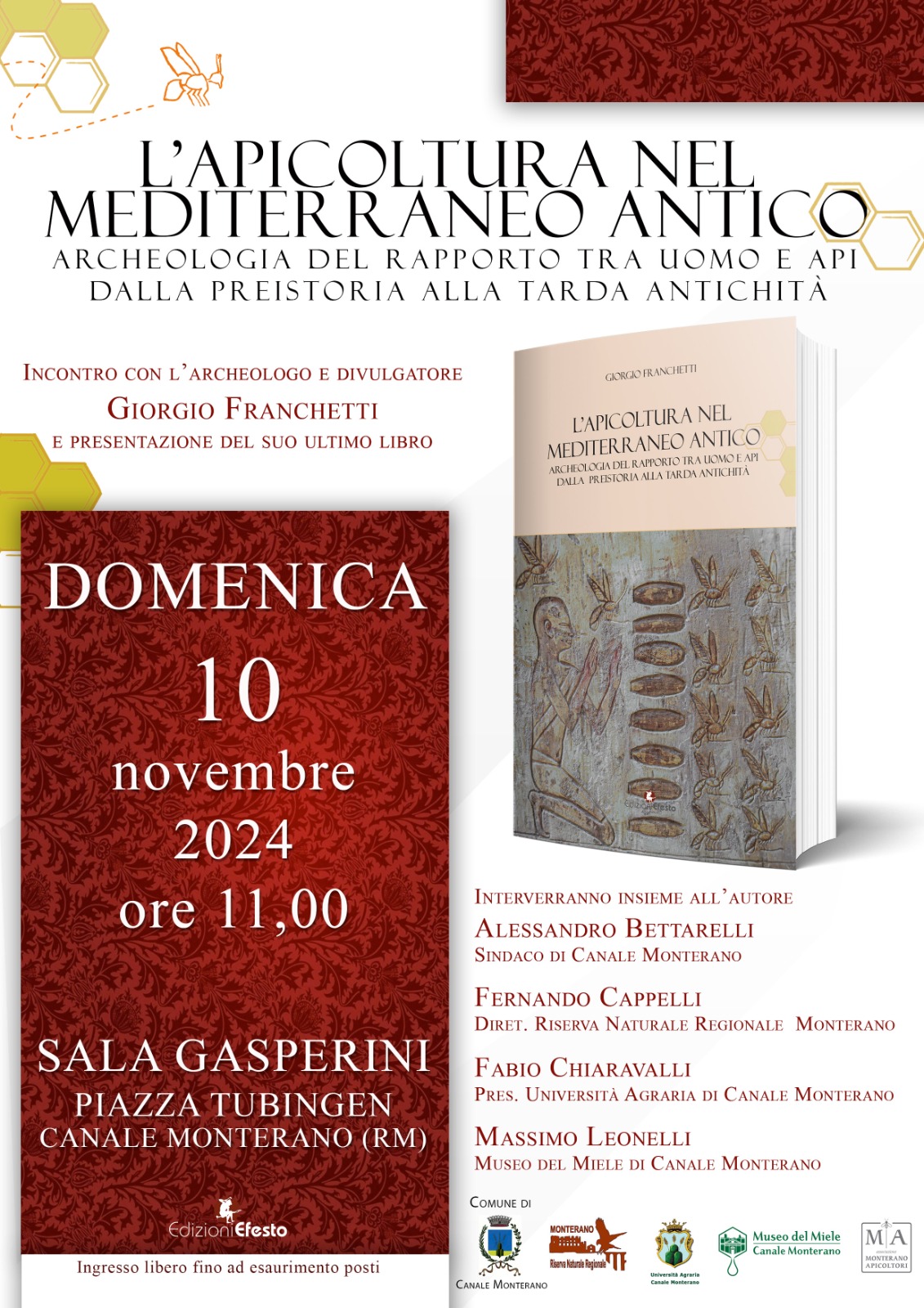Domenica 10 novembre dalle ore 11 presso la Sala Gasperini in Piazza Tubingen, a Canale Monterano (RM), si terrà una nuova presentazione del saggio “L’apicoltura nel Mediterraneo antico. Archeologia del rapporto tra uomo e api dalla preistoria alla tarda antichità”, del divulgatore storico Giorgio Franchetti. L’incontro sarà preceduto da una visita al sottostante Museo del Miele, a partire dalle ore 10.