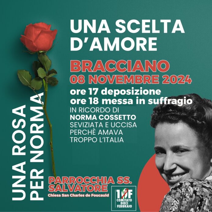 Si è svolta ieri alle 17y in via delle Palme, 6/B, a Bracciano, nella Parrocchia SS. Salvatore, “Una rosa per Norma Cossetto”, promossa in tutta Italia dal Comitato 10 Febbraio per onorare la memoria della giovane istriana, seviziata e uccisa nel 1943 dai partigiani comunisti slavi.